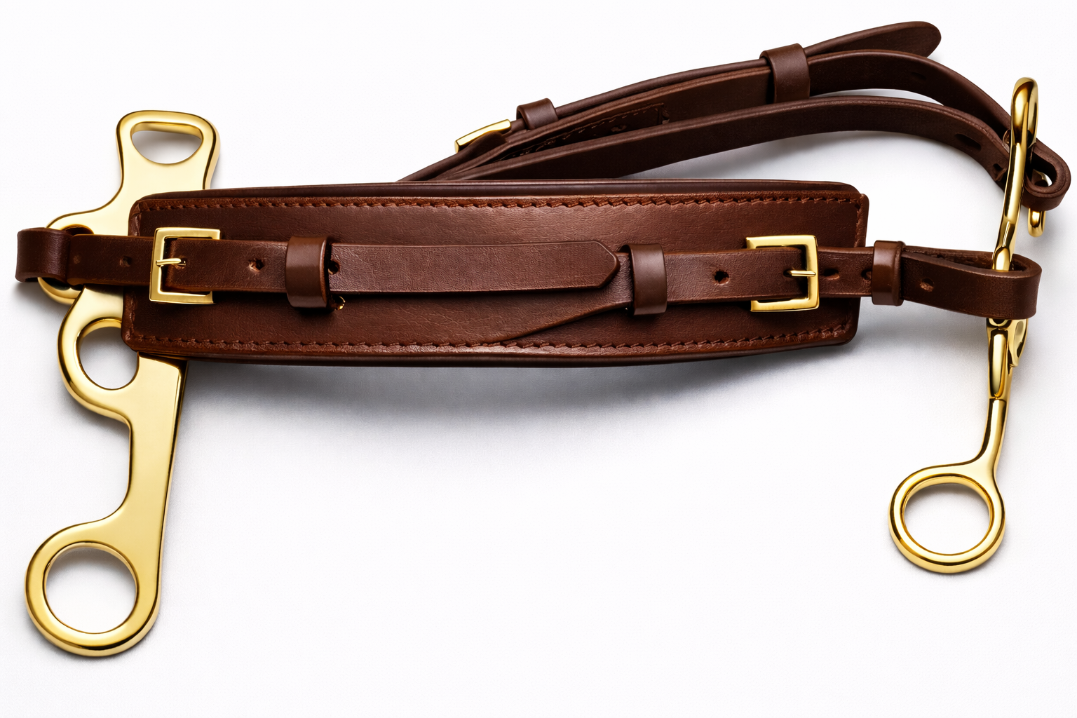 Rowland Hackamore Straight Brass Shanks with Genuine Leather Nose-band is a unique piece of horse tack that replaces the traditional bit in a bridle. It usually features a nose-band with reins attached, allowing for control by applying pressure to the horse’s nose and face instead of its mouth. This makes it a great option for training or riding horses that might have dental problems or are particularly sensitive to bits.