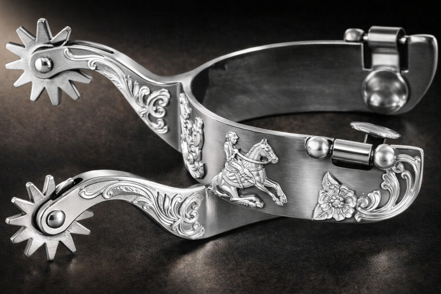 Stainless Steel Vintage Cowboy Spurs Black with brass etched buttons and cutting Rowel are collectible items that reflect the rich history and culture of the American West.